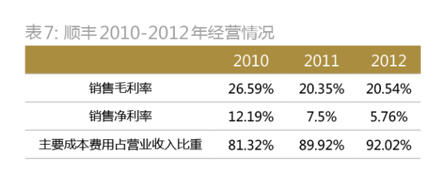 从顺丰模拟的合并财务报表所反映的数据来看,也印证了上述说法。2010-2012年,顺丰的毛利率、净利率下降幅度较大,而同期人工、运输、材料、房租等主要成本费用占收入的比重在逐步上升(表7)。