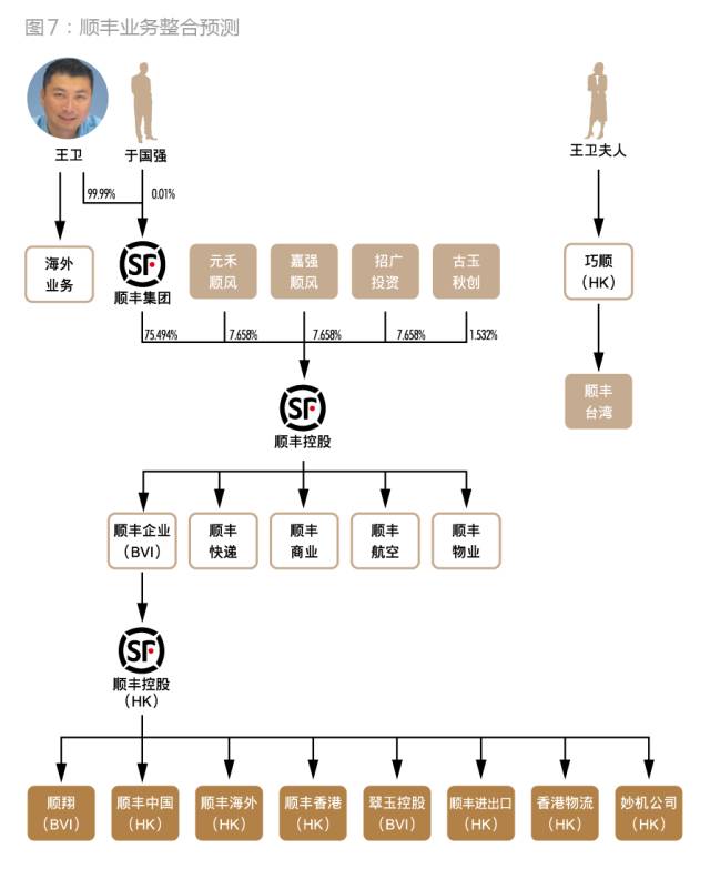 一是除顺丰企业(BVI)99%股权被王卫控制之外,顺丰其他海外业务单位的股权皆为王卫的夫人控制,增加了整合的麻烦程度。
