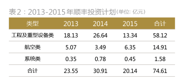 根据顺丰发展规划,顺丰未来在巩固并发展其主营快递业务的基础上,还将在航空货运、物流仓储、电子商务、金融支付等领域积极拓展,通过“三流合一”的整合服务实现转型升级。为实施这一规划,未来3年顺丰将投入75亿元(表2)。