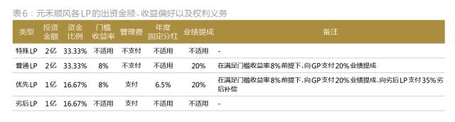 在元禾顺风这家有限合伙企业中,其普通合伙人由元禾控股和其管理团队共同设立的元禾重元担任,其有限合伙人(LP)则包括了元禾控股、博裕资本、国开金融、中国人寿集团旗下的国寿投资控股有限公司(以下简称国寿投资)和中国太平洋保险集团旗下的太平洋资产管理有限公司(以下简称太平洋资产)。同时根据投资偏好的不同,元禾控股将各有限合伙人划分成了特殊LP、优先LP、普通LP以及劣后LP(图5),并明确了相应的投资收益标准及权利义务(表6)。