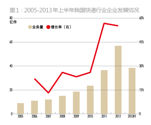 所谓时势造英雄,王卫在完成顺丰集团业务整合后,便赶上了中国快递行业的飞速发展期,特别是近几年电子商务的快速发展,为快递行业带来新的业务增长点。国家邮政局统计数据显示,2005年至今,我国快递行业保持着较快的增长速度。2012年全国规模以上快递服务企业业务量同比增长55%;快递业务收入完成1055.3亿元,同比增长39%;2013年上半年,业务量累计完成38.4亿件,业务收入累计完成629.8亿元(图1)。顺丰集团在王卫的带领下,也走上了快速发展的康庄大道。