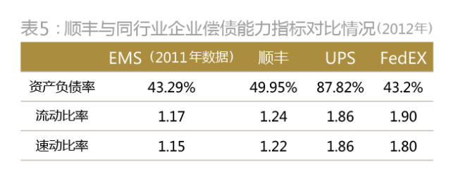 另外,从顺丰的财务弹性而言,其仍具有较好的融资空间。截至2012年底,顺丰资产127.42亿元,负债63.65亿元,资产负债率为49.95%。近3年,顺丰资产负债率一直保持在50%左右,优于UPS,与FedEX、EMS相当;其流动比率和速动比率则优于EMS(表5)。