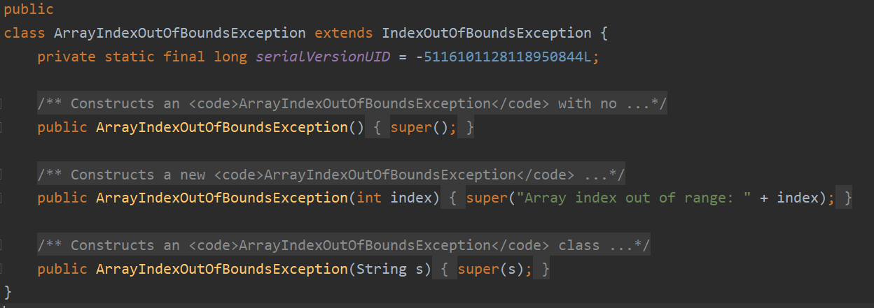 自定义一个异常,最好的方法就是查看java是怎么定义其他异常类的,我们选择打开ArrayIndexOutOfBoundsException