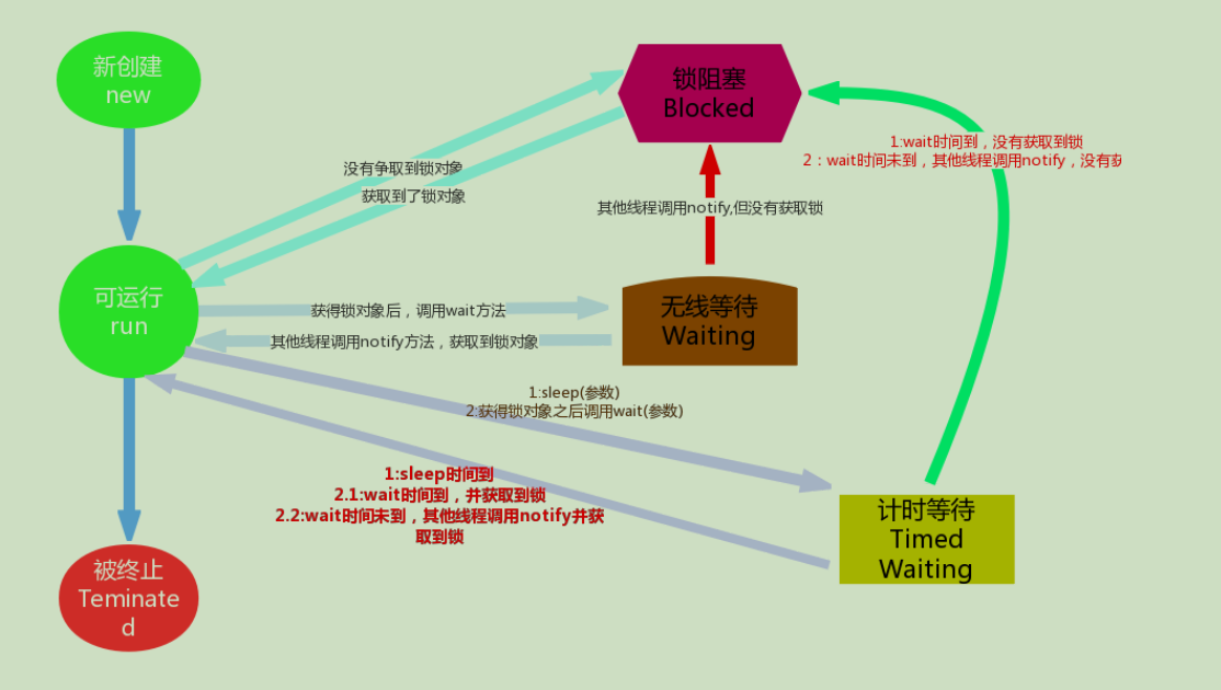 线程想获取一个锁对象,但该锁对象被其他线程持有了,该线程就进入了阻塞状态;当该线程获取了锁对象后就进入Runnable状态 |