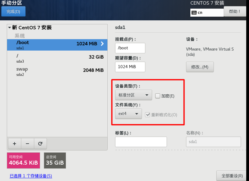 分区情况如下:一个boot区,一个交换区,一个Linux系统的根目录