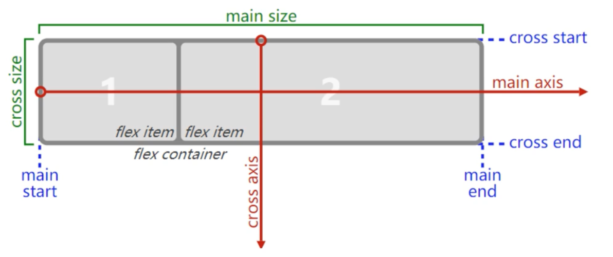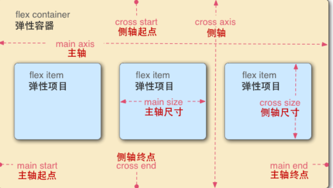 flex items 默认是沿着main axis(主轴) 从mian start 开始往main end 方向排布