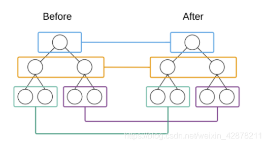 对操作前后的dom树同一层的节点进行对比,一层一层对比,如下图: