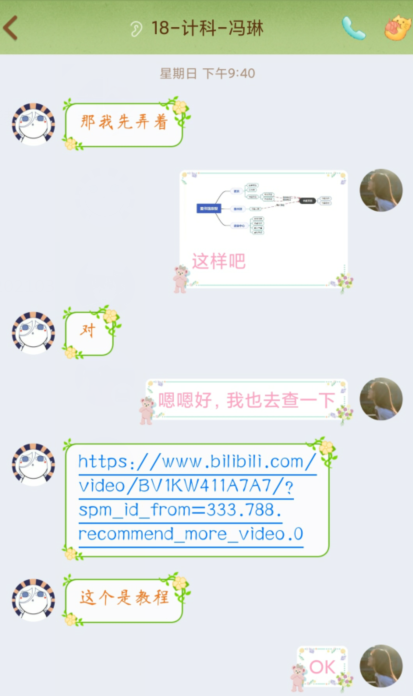对冯琳的评价:冯琳同学的自主学习能力很强,在刚开始时就分享给我一些教程一起学习,制定思维导图,把握整个框架。我们的分工很完美,合作非常愉快~