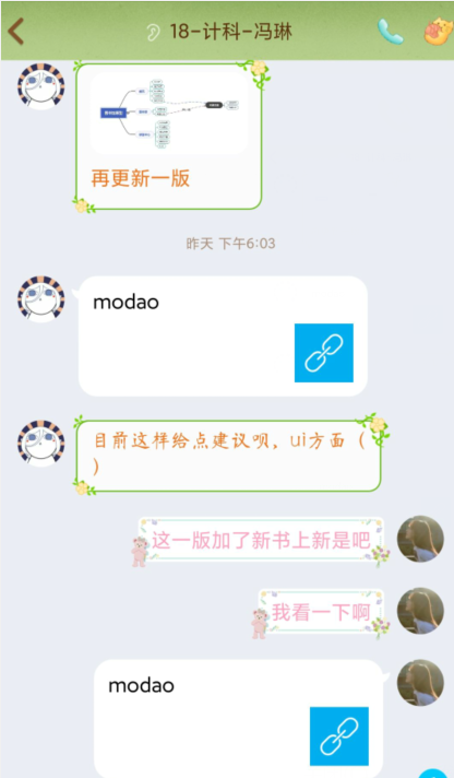 王纯纯:在老师布置完新的作业之后,感觉这次的作业非常有趣,是为学校的图书馆进行小程序的原型设计,包括年度报告和自己创新更加人性化的新功能。会使用到墨刀等工具。这对于我来说又是一个新的工具,需要不断用心去学习,虽然过程中会遇到很多问题,但是在一步一步学习新知识的过程还是很享受的。