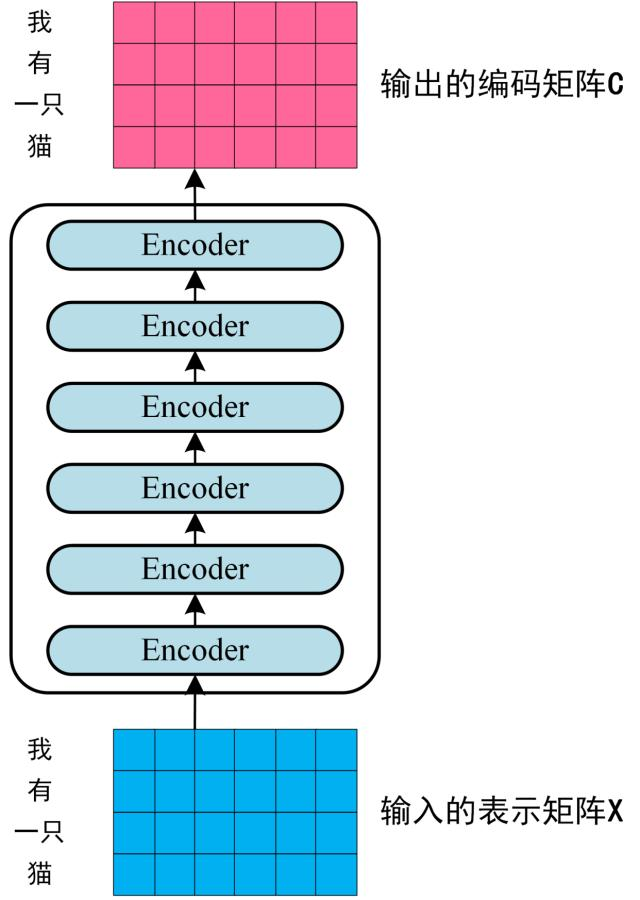 第二步: 将得到的单词表示向量矩阵 (如上图所示,每一行是一个单词的表示 x) 传入 Encoder 中,经过 6 个 Encoder block 后可以得到句子所有单词的编码信息矩阵C,如下图。单词向量矩阵用\(X_{n\times d}\)表示, n 是句子中单词个数,d 是表示向量的维度 (论文中 d=512)。每一个 Encoder block 输出的矩阵维度与输入完全一致。