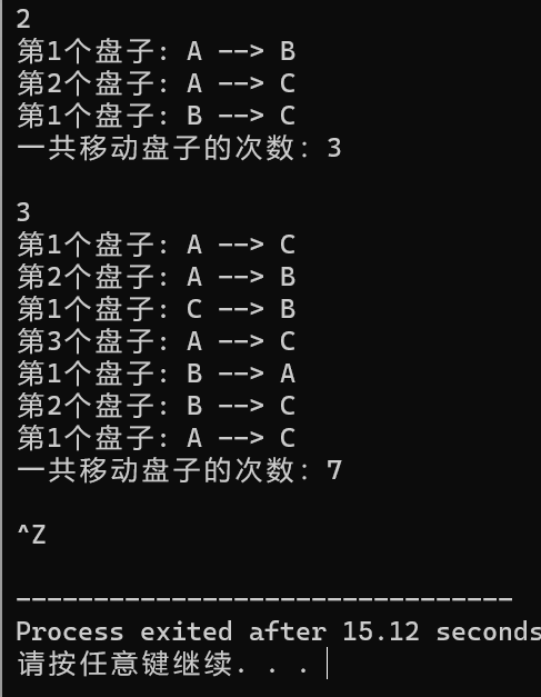#include <stdio.h> int h(int m); void hanoi(unsigned n, char from, char temp, char to); void moveplate(unsigned n, char from ,char to); int main() { unsigned n; int s; while(scanf("%u", &n) != EOF) { hanoi(n, 'A', 'B', 'C'); printf("一共移动盘子的次数:%ld",h(n)); } 0; } void hanoi(unsigned n, char from, char temp, char to) { if(n==1) moveplate(n, from, to); else { hanoi(n-1, from , to, temp); moveplate(n, from, to); hanoi(n-1, temp, from, to); } } void moveplate(unsigned n, char from, char to) { printf("第%u个盘子: %c --> %c\n", n, from, to); } int h(int m) { int s; if(m==1) s=1; else s=2*h(m-1)+1; return s; }