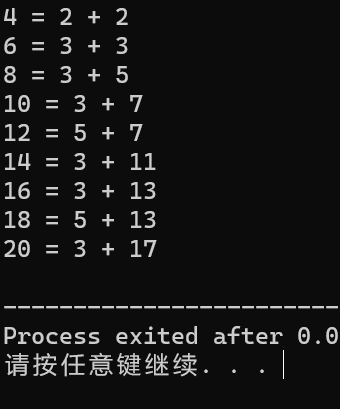 #include<stdio.h> #include<math.h> #define N 20 int is_prime(int n); int main() { int m,i,a,b; { for(m=4;m<=N;m+=2) { for(i=2;i<=m;i++) { if(is_prime(i)&&is_prime(m-i)) {a=i;b=m-i;break;} } printf("%d = %d + %d \n",m,a,b); } } return 0; } int is_prime(int n) { int j,k, Flag=1; k=sqrt(n); if(n==2) return Flag=1; else for(j=2;j<=k;j++) { if((n%j)==0) {Flag=0; break;} } return Flag; }