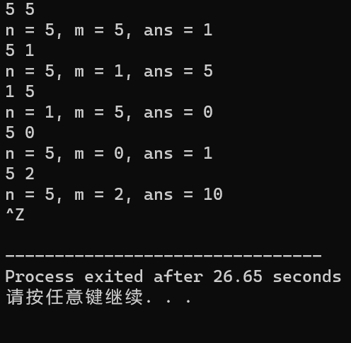 #include <stdio.h> int func(int n, int m); int main() { int n, m; while(scanf("%d%d", &n, &m) != EOF) printf("n = %d, m = %d, ans = %d\n", n, m, func(n, m)); return 0; } int comb(int n){ int i,p=1; for(i=1;i<=n;i++) p=p*i; return p; } int func(int n,int m){ int a,b,c; a=comb(n-1)/(comb(m)*comb(n-1-m)); b=comb(n-1)/(comb(m-1)*comb(n-1-m+1)); c=a+b; }