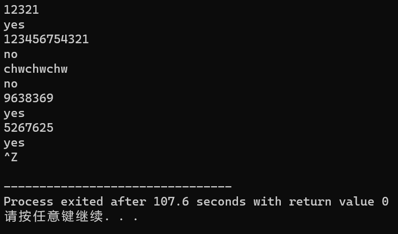 # include <stdio.h> # define N 80 int func(char *); int main(){ char str[80]; while (gets(str)!= NULL){ if(func(str)) printf("yes\n"); else printf("no\n"); } return 0; } int func(char *str) { char *begin, *end; begin = end = str; while (*end) end++; end--; while(begin<end) { if(*begin !=*end) return 0; else { begin++; end--; } } return 1; }