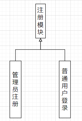 在本系统中,普通用户和管理员都是系统的用户,所以可以抽象出用户类,在该类中定义用户的类型,基于这一设计,系统的管理员注册模块和普通用户的注册模块可以抽象出注册模块,而管理员和普通用户的注册是这一模块的具体实现。同理,系统的登录模块同样的道理。下图是注册模块的泛化视图。