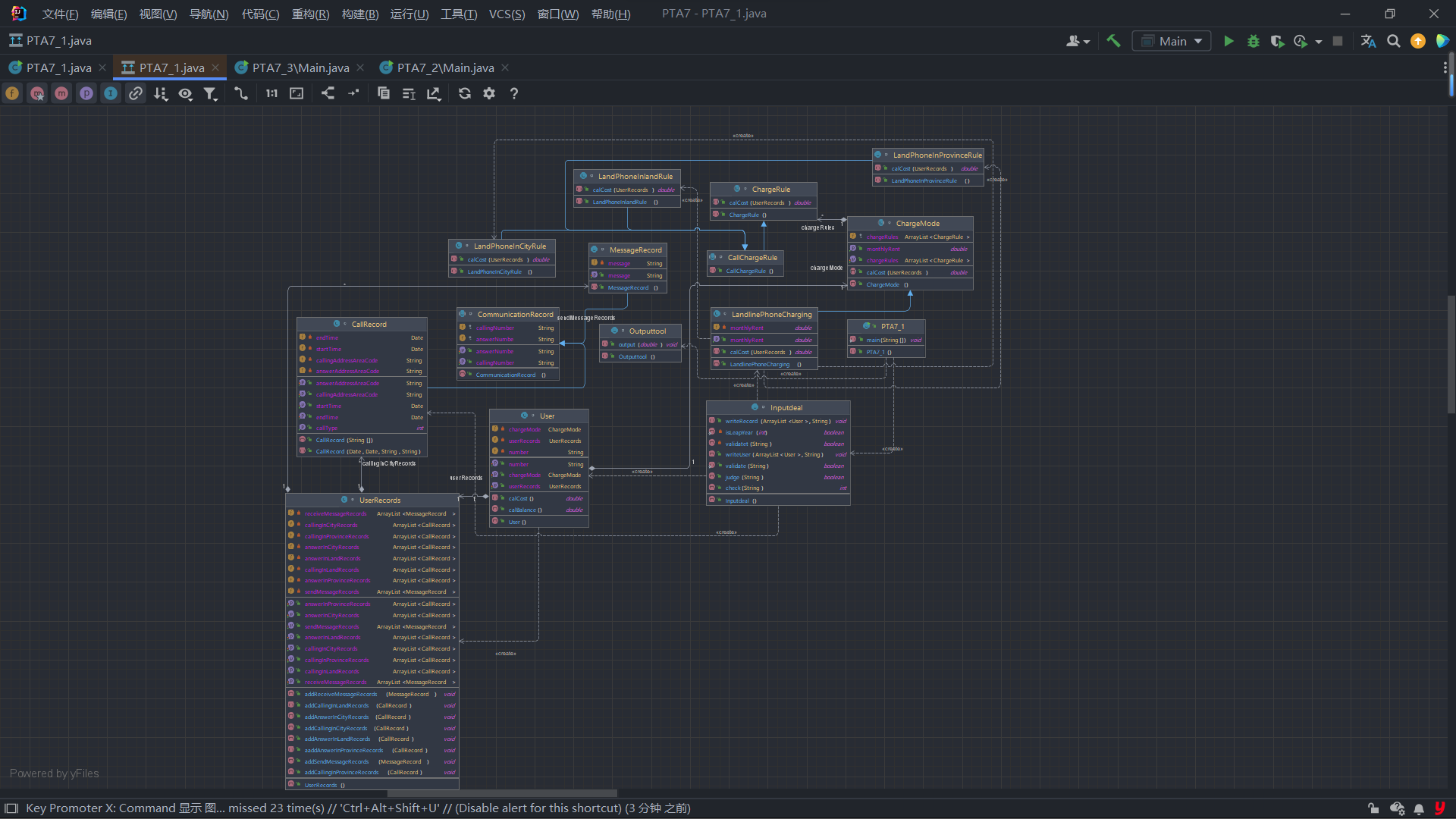 输入数据中出现的不符合格式要求的行一律忽略。本题只做格式的错误判断,无需做内容上不合理的判断,比如同一个电话两条通讯记录的时间有重合、开户号码非南昌市的号码等,此类情况都当成正确的输入计算。但时间的输入必须符合要求,比如不能输入2022.13.61 28:72:65。建议类图: