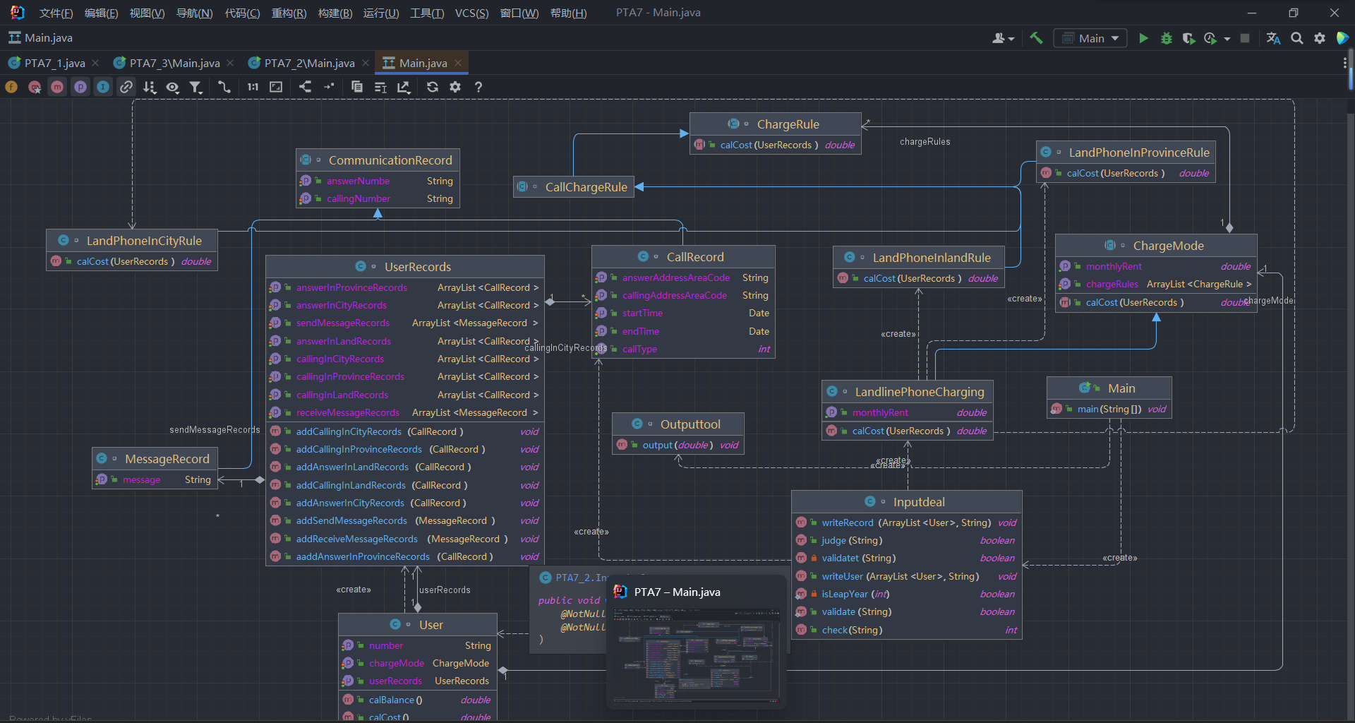 LandPhoneInCityRule、LandPhoneInProvinceRule、LandPhoneInLandRule三个类分别是座机拨打市内、省内、省外电话的计费规则类,用于实现这三种情况的费用计算。(提示:可以从UserRecords类中获取各种类型的callRecords)。注意:以上图中所定义的类不是限定要求,根据实际需要自行补充或修改。