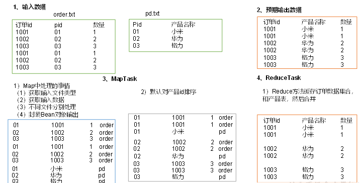 3)在map方法中,根据pid,通过hashmap找到pname,替换pid,写出结果;
