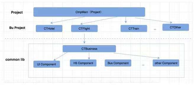 进行功能解耦的重要思想,就是实行轻重分离,主次分明的思想;在代码模块的组织架构上进行重要的调整,保证主要重要的App功能快速迭代和性能稳定,将附属的使用频率不高的新功能,使用H5容器进行动态加载,所以在V2.0的架构上,携程App就是个典型的Hybrid App ,可以看到刚开始就核心模块酒店和机票采用Native 进行开发,其他模块基本是采用H5去实现。