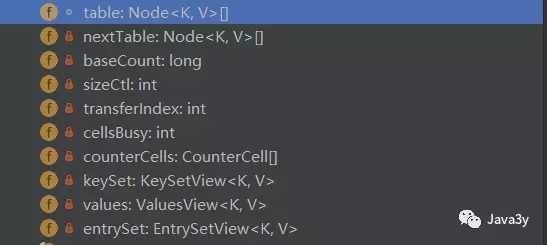 1 /* ---------------- Fields -------------- */ 2 3 /** 4 * The array of bins. Lazily initialized upon first insertion. 5 * Size is always a power of two. Accessed directly by iterators. 6 */ 7 transient volatile Node<K,V>[] table; 8 9 /** 10 * The next table to use; non-null only while resizing. 11 */ 12 private transient volatile Node<K,V>[] nextTable; 13 14 /** 15 * Base counter value, used mainly when there is no contention, 16 * but also as a fallback during table initialization 17 * races. Updated via CAS. 18 */ 19 private transient volatile long baseCount; 20 21 /** 22 * Table initialization and resizing control. When negative, the 23 * table is being initialized or resized: -1 for initialization, 24 * else -(1 + the number of active resizing threads). Otherwise, 25 * when table is null, holds the initial table size to use upon 26 * creation, or 0 for default. After initialization, holds the 27 * next element count value upon which to resize the table. 28 */ 29 private transient volatile int sizeCtl; 30 31 /** 32 * The next table index (plus one) to split while resizing. 33 */ 34 private transient volatile int transferIndex; 35 36 /** 37 * Spinlock (locked via CAS) used when resizing and/or creating CounterCells. 38 */ 39 private transient volatile int cellsBusy; 40 41 /** 42 * Table of counter cells. When non-null, size is a power of 2. 43 */ 44 private transient volatile CounterCell[] counterCells; 45 46 // views 47 private transient KeySetView<K,V> keySet; 48 private transient ValuesView<K,V> values; 49 private transient EntrySetView<K,V> entrySet;