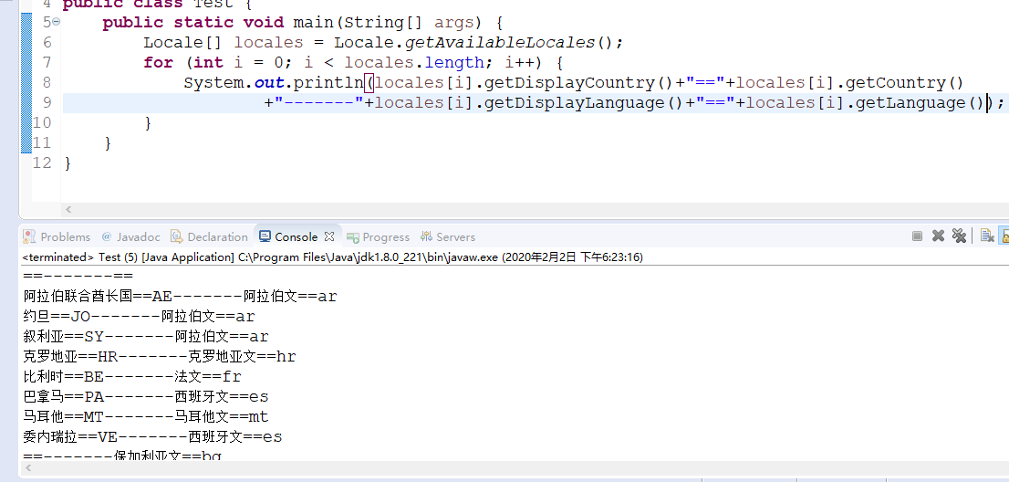 事实上,Java不可能支持所有的国家和语言,如果需要获取Java所支持的国家和语言,则可以调用Locale类的getAvailableLocales()方法,该方法返回一个Locale数组,该数组里包含了Java所支持的国家和语言。