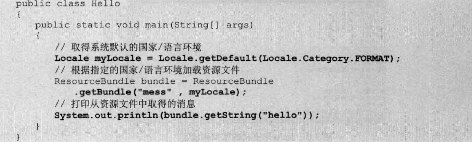 Java还提供了简单的国际化支持,Java使用Locale封装一个国家、语言环境,再使用ResourceBundle根据Locale加载语言资源包加载语言资源包,当ResourceBundle加载了指定Locale对应资源文件,ResourceBundle加载了指定Locale对应的语言资源文件后,ResourceBundle对象就可以调用getString方法来取出指定key所对应的消息字符串。