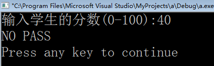 #include<stdio.h> main() { int mark; printf("输入学生的分数(0-100):"); scanf("%d",&mark); switch(mark/10) { case 10: case 9:printf("A\n"); break; case 8:printf("B\n"); break; case 7:printf("C\n"); break; case 6:printf("D\n"); break; default:printf("NO PASS\n");break; } }