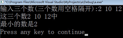 #include<stdio.h> main() { int a,b,c,min; printf("输入三个数(三个数用空格隔开):"); scanf("%d %d %d",&a,&b,&c); min=a<b?a:b; printf("这三个数%d %d %d中\n最小的数是%d\n",a,b,c,min); }