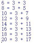 1 def is_prime(n): 2 for i in range(2,n+1): 3 if n % i == 0 or n == 2: 4 return False 5 else: 6 return True 7 8 prime_list = [] 9 for n in range(2,21): 10 if is_prime(n) == True: 11 prime_list.append(n) 12 else: 13 pass 14 i = 2 15 while i <= 20: 16 j = 0 17 while j < len(prime_list): 18 k = 0 19 while k <len(prime_list): 20 if prime_list[j] + prime_list[k] == i: 21 print(f'{i} = {prime_list[j]} + {prime_list[k]}') 22 else: 23 pass 24 k += 1 25 break # 找到后停止该循环 26 j += 1 27 i += 2