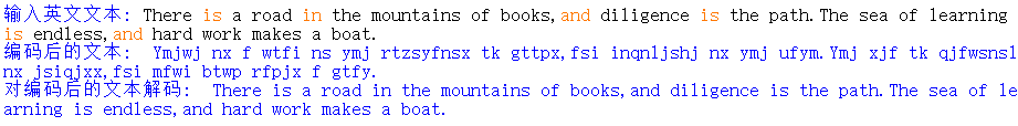 # 编码函数encoder()定义 def encoder(text): text_list = list(text) for i in range(len(text_list)): if ord('a') <= ord(text_list[i]) <= ord('z'): add5 = ord(text_list[i]) + 5 if add5 <= ord('z'): text_list[i] = chr(add5) else: add5 = add5 % ord('z') - 1 +ord('a') text_list[i] = chr(add5) elif ord('A') <= ord(text_list[i]) <= ord('Z'): add5 = ord(text_list[i]) + 5 if add5 <= ord('z'): text_list[i] = chr(add5) else: add5 = add5 % ord('Z') - 1 +ord('A') text_list[i] = chr(add5) else: pass return ''.join(text_list) # 解码函数decoder()定义 def decoder(text): text_list = list(text) for i in range(len(text_list)): if ord('a') <= ord(text_list[i]) <= ord('z'): red5 = ord(text_list[i]) - 5 if ord('a') <= red5: text_list[i] = chr(red5) else: red5 = ord('z') - (ord('a') - red5 - 1) text_list[i] = chr(red5) elif ord('A') <= ord(text_list[i]) <= ord('Z'): red5 = ord(text_list[i]) - 5 if ord('A') <= red5: text_list[i] = chr(red5) else: red5 = ord('Z') - (ord('A') - red5 - 1) text_list[i] = chr(red5) else: pass return ''.join(text_list) # 主体代码逻辑 text = input('输入英文文本: ') encoded_text = encoder(text) print('编码后的文本: ', encoded_text) decoded_text = decoder(encoded_text) print('对编码后的文本解码: ', decoded_text)