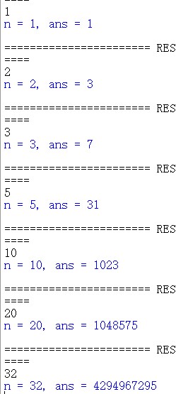 1 # 函数func()定义 2 def func(n): 3 if n == 1: 4 ans = 2 - 1 5 else: 6 ans = 2 * func(n-1) +1 7 n -= 1 8 return ans 9 # 10 while True: 11 x = input() 12 if x == '#': 13 print('计算结束') 14 break 15 n = int(x) 16 ans = func(n) 17 print(f'n = {n}, ans = {ans}')