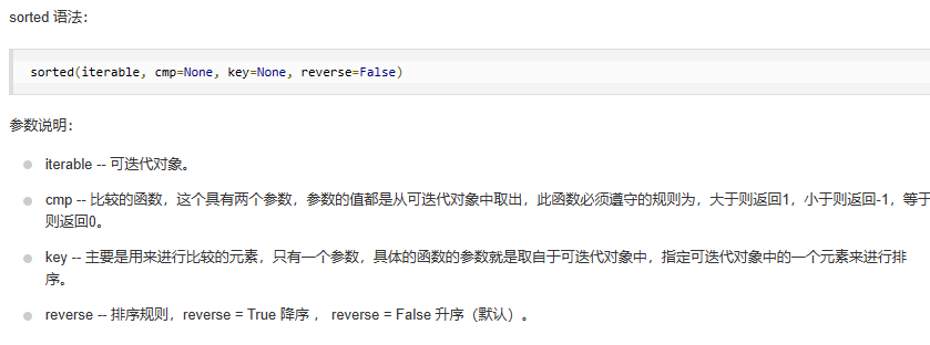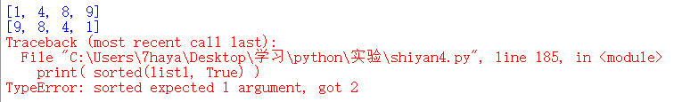 1 list1 = [1, 9, 8, 4] 2 print( sorted(list1) ) 3 print( sorted(list1, reverse=True) ) 4 print( sorted(list1, True) )