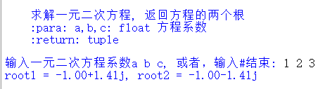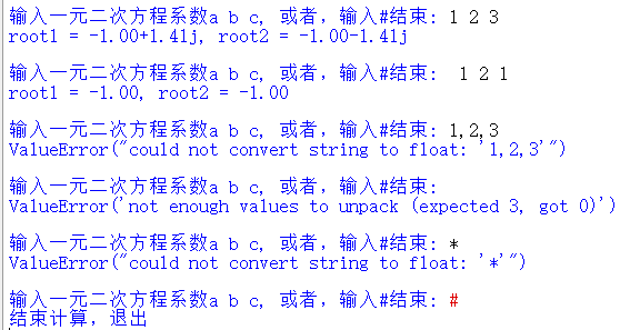 1 def solve(a, b, c): 2 ''' 3 求解一元二次方程, 返回方程的两个根 4 :para: a,b,c: float 方程系数 5 :return: tuple 6 ''' 7 delta = b*b - 4*a*c 8 delta_sqrt = abs(delta)**0.5 9 p1 = -b/2/a 10 p2 = delta_sqrt/2/a 11 12 if delta >= 0: 13 root1 = p1 + p2 14 root2 = p1 - p2 15 else: 16 root1 = complex(p1, p2) 17 root2 = complex(p1, -p2) 18 19 return root1, root2 20 21 while True: 22 try: 23 t = input('输入一元二次方程系数a b c, 或者,输入#结束: ') 24 if t == '#': 25 print('结束计算,退出') 26 break 27 a, b, c = map(float, t.split()) 28 if a == 0: 29 raise ValueError('a = 0, 不是一元二次方程') 30 except ValueError as e: 31 print(repr(e)) 32 print() 33 except: 34 print('有其它错误发生\n') 35 else: 36 root1, root2 = solve(a, b, c) 37 print(f'root1 = {root1:.2f}, root2 = {root2:.2f}') 38 print()