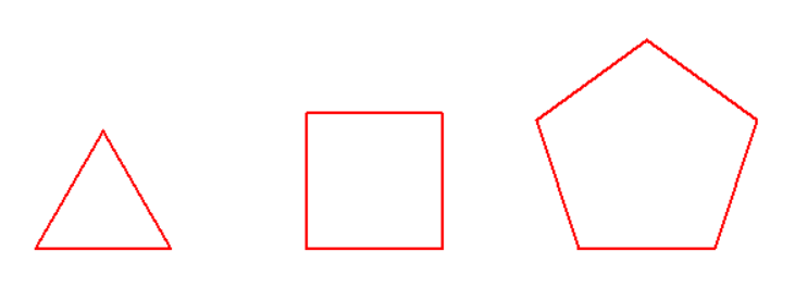 from turtle import * def moveto(x,y): ''' 画笔移动到坐标(x,y)处 ''' penup() goto(x,y) pendown() def draw(n,size = 100): ''' 绘制边长为size的正n边形 ''' for i in range(n): fd(size) left(360/n) def main(): pensize(2) pencolor('red') moveto(-200,0) draw(3) moveto(0,0) draw(4) moveto(200,0) draw(5) hideturtle() done() main()