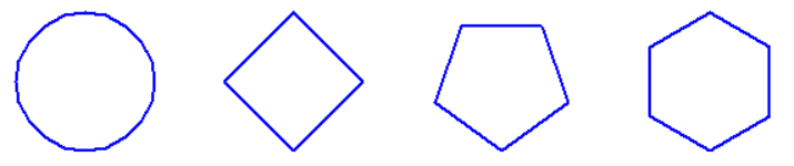 # 运用circle函数,实现正多边形绘制 from turtle import * def moveto(x,y): ''' 画笔移动到坐标(x,y)处 ''' penup() goto(x,y) pendown() def main(): pensize(2) pencolor('blue') moveto(-150,0) circle(50) moveto(0,0) circle(50,steps = 4) moveto(150,0) circle(50,steps = 5) moveto(300,0) circle(50,steps = 6) hideturtle() done() main()