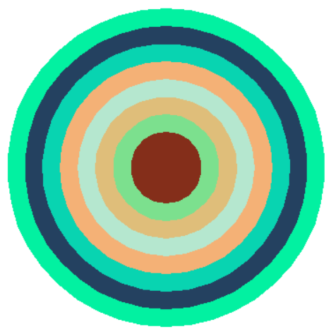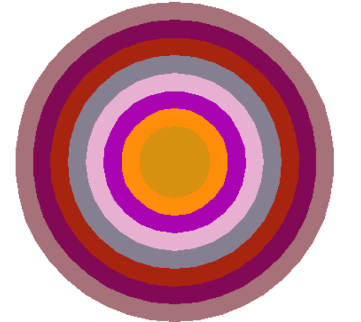 # 以(0, 0)为圆心,绘制9个彩色同心圆,色彩随机生成 from turtle import * from random import random def moveto(x, y): penup() goto(x, y) pendown() def gen_color(): ''' 生成一个以rgb三元组表示的颜色值并返回 ''' return tuple((random() for i in range(3))) def main(): setup(800, 600) radius = 180 # 圆初始半径 offset = 20 # 同心圆每次位移量 for i in range(8): moveto(0, -radius) color(gen_color()) begin_fill() circle(radius) end_fill() radius -= offset hideturtle() done() main()