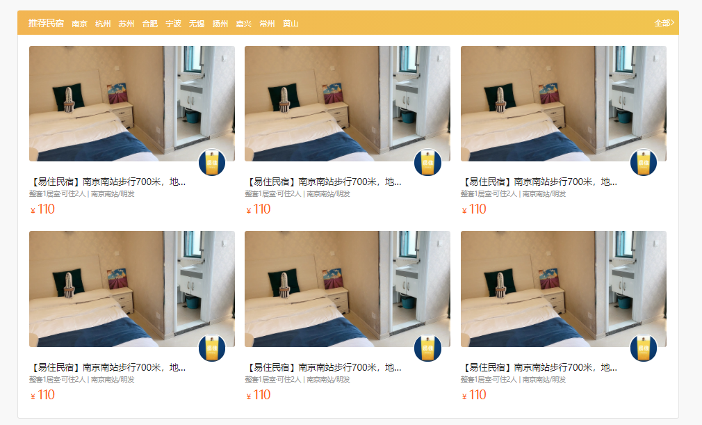 下面两行大家自由发挥吧,大差不差肉眼看着没差别就行。然后就是无脑复制粘贴就行,对于每一块都要设置浮动,是他们横向排列,强调一定一定要在父级边框中清除浮动。至此,推荐民宿部分完成,呜呼,已经三分之二了,胜利就在眼前。