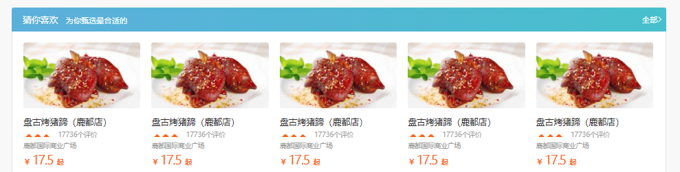 避免篇幅太长就截了最上面一行,当时快中午写到这里,看到这诱人的猪蹄儿着实有点饿了,忍者口水硬着头皮在这写。其实这部分可以说没啥难度了,index区域直接套用上面的,改一个背景颜色和列表文字就行,内容区域和推荐民宿部分样式一样,只需要另外改一下高度就行,并且每个小块里面就是上面一个图片,下面几行文字,连个定位都不需要,就是文字第二行开头部分应该是五颗星,这个星星好像是iconfont搞定的,我不会,就用三角形代替了。