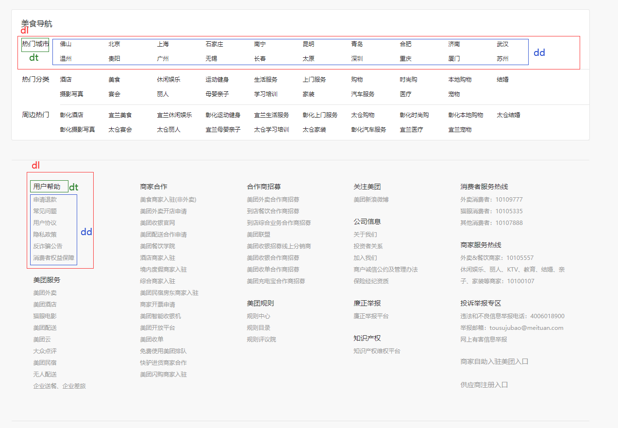 以上主要分为两个部分,第一部分是美食导航区域,第二部分是底部链接区域,也就是给部分样式加了浮动,连定位都没有用到。但是越简单的布局越要重视,如何能够用最简单的代码写出来才是真本事。这两部分用的最多的就是dl、dt和dd列表标签,但并不局限于使用这些标签,例如span或者ul、li标签都可以实现,说实话我对列表标签并不是很熟悉,完全是参考官方样式结构写的,所以我也不能说列表标签一定优于其他标签,就当复习HTML基础了吧。
