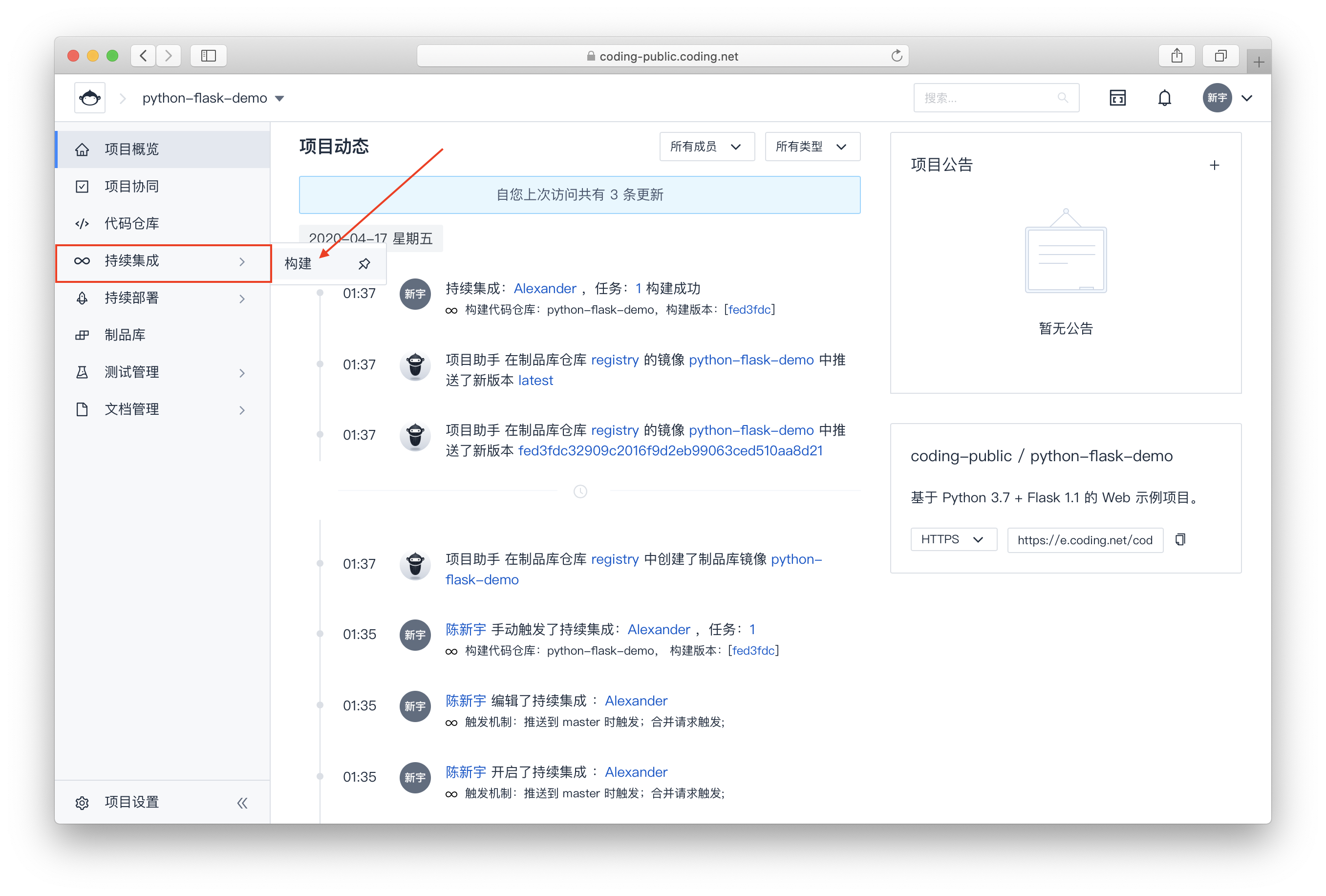 首先,进入你的项目,选择左侧导航栏中的 持续集成,然后点击其右侧的 构建: