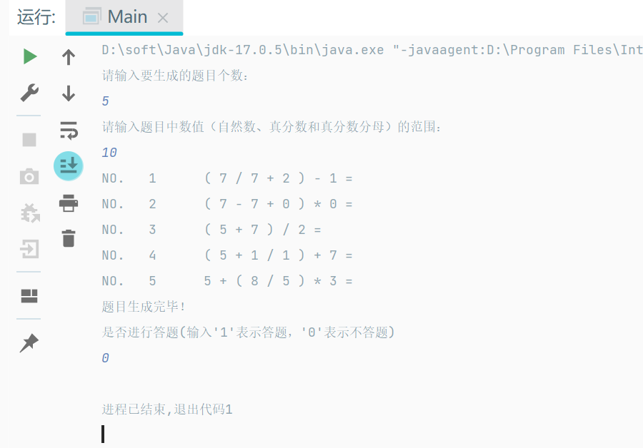 首先输入要生成的题目数及数值范围,本次运行设置题目个数为10,数值范围为5。