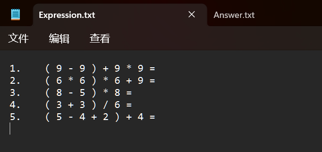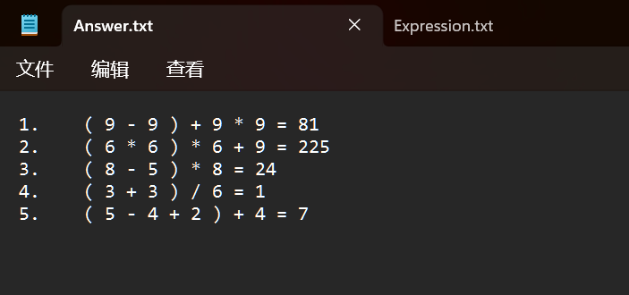 Calculate方法计算的时候,把含有以上两种情况的式子都会返回100000,根据这个信息判断式子是否合法。查重时,通过比对式子和已生成的中间结果,如果重复则重新生成。把符合条件的式子写入到expression文件中,答案写在answer文件中。 -