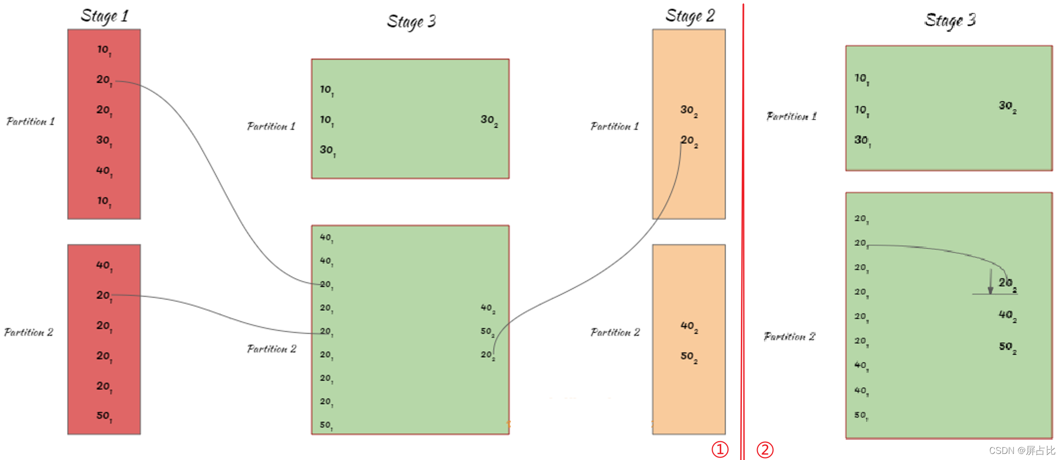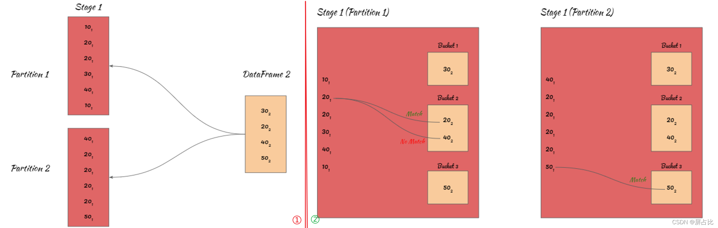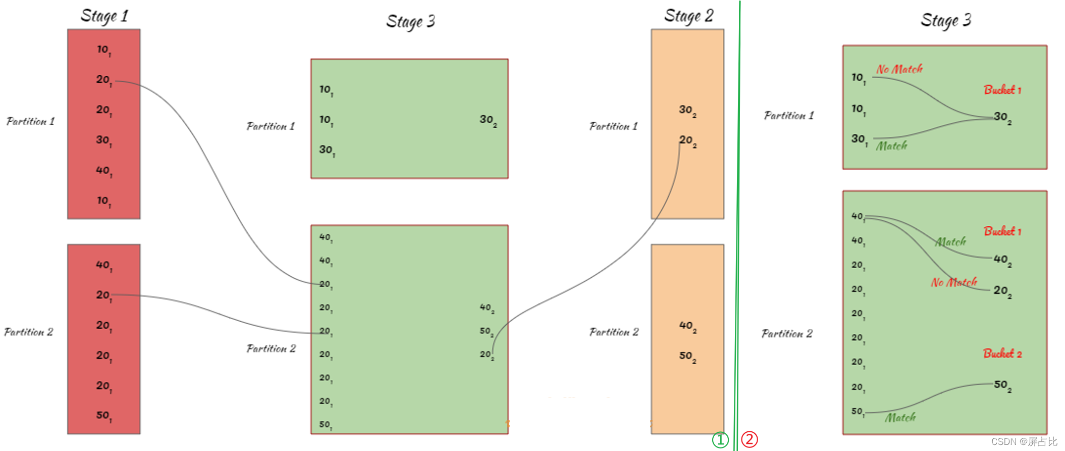 整个过程如上图所示,其中 10₁ 表示10来自DataFrame1,30₂表示来自DataFrame2;2个分区,2个task,1个stage(没有shuffle)。