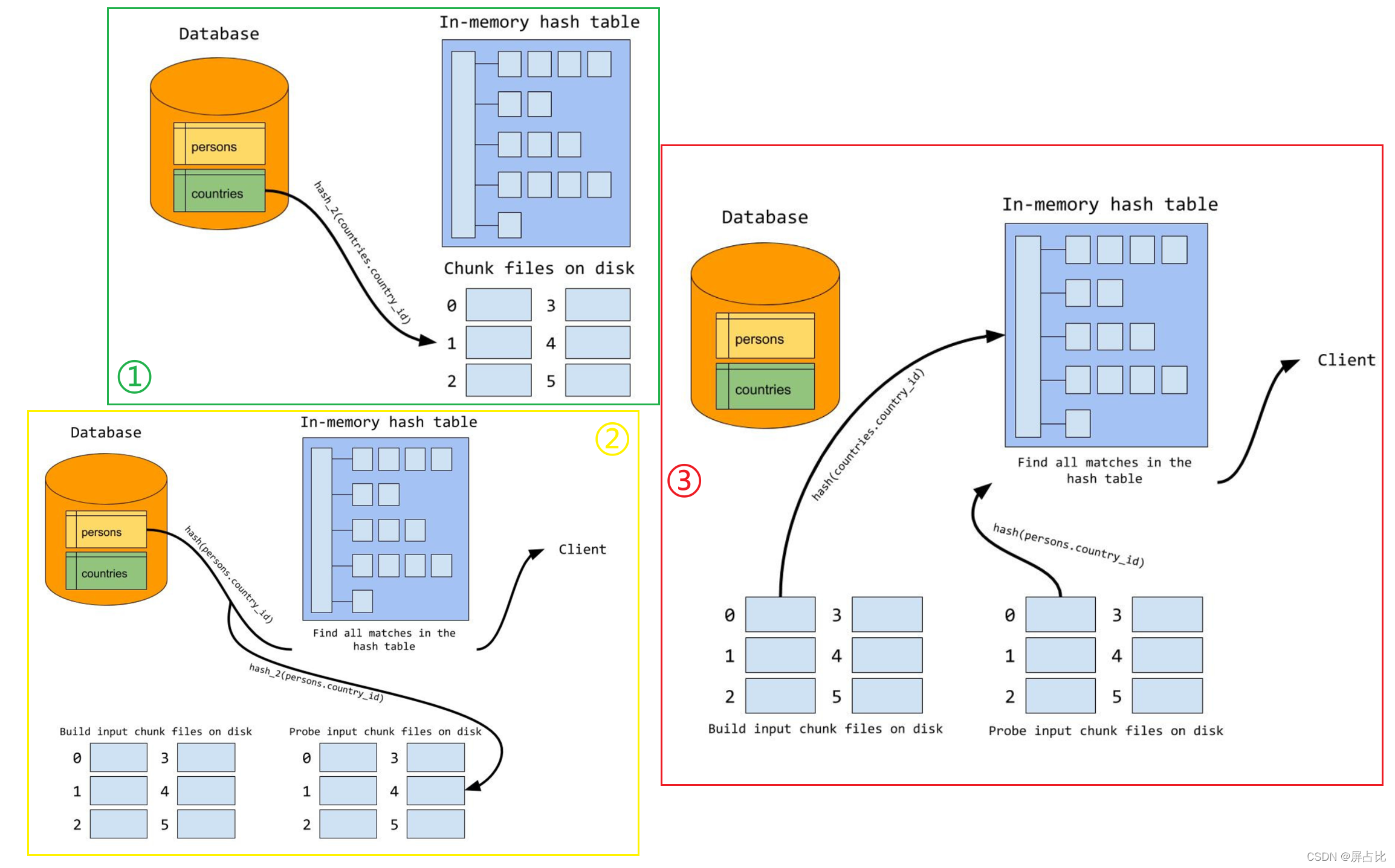 X个哈希桶 - 哈希函数几乎均匀地分布每个关系内数据的哈希值,就是说哈希桶大小一致。