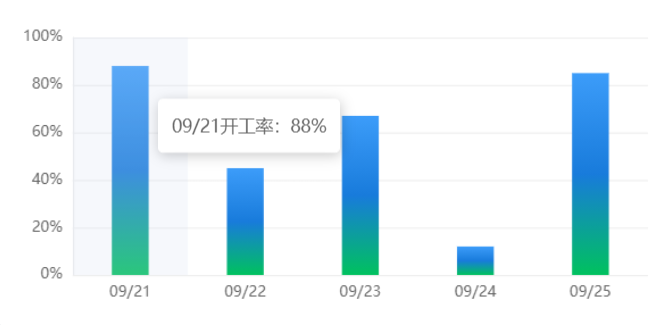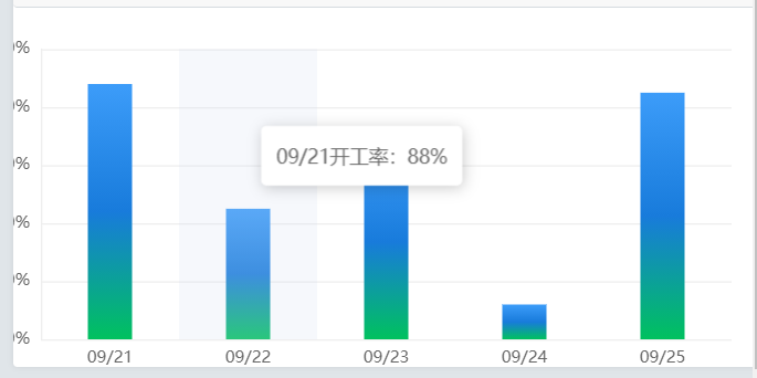 let xData = ['09/21', '09/22', '09/23', '09/24', '09/25'], data = [88, 45, 67, 12, 85]; // if (list.length) { // list.forEach((m) => { // xData.push(m.date.replace('-', '/')); // data.push(parseFloat(m.ratio)); // }); // } let option = { tooltip: { trigger: 'axis', axisPointer: { type: 'shadow' }, // 默认为直线,可选为:'line' | 'shadow' formatter: '{b}{a}:{c}%', // 格式化文档 }, grid: { // 直角坐标系内绘图网格, 可以理解为拉伸定位 top: '30px', bottom: '20px', left: '20px', right: '20px', containLabel: true, // grid 区域是否包含坐标轴 }, xAxis: { type: 'category', data: xData, // 间隔名字 axisLine: { show: false }, // 轴线 axisTick: { show: false }, // 刻度 splitLine: { show: false }, // 分隔线 axisLabel: { color: '#666666' }, }, yAxis: { // name: '单位', // 坐标轴名称 type: 'value', min: 0, // y轴最小值 max: 100, // y轴最大值 axisLabel: { formatter: '{value}%', // y轴1%-100%格式化 color: '#666666', }, axisLine: { show: true, lineStyle: { color: '#eeeeee' } }, // 轴线 splitLine: { show: true, lineStyle: { color: '#eeeeee' } }, // 分隔线 // nameTextStyle: { color: '#777777' }, // 名字样式 axisTick: { show: false }, // 刻度 }, series: [ { name: '开工率', type: 'bar', barWidth: '32%', // 柱子宽度 label: { show: false, // 数据是否在柱子上展示 position: 'top',
