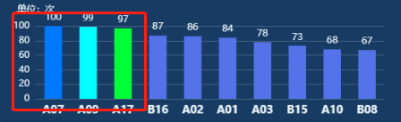let data = [], xData = []; list.forEach((m, i) => { xData.push(m.t); if (i < 3) { data.push({ value: m.weekPoliceCount, itemStyle: { color: i === 0 ? '#0078FF' : i === 1 ? '#00feff' : '#00ff38', }, }); } else { data.push(m.weekPoliceCount); } }); // 处理结果为 数据随意填的, 看格式就好 data =[ { value: 85, itemStyle: { color: '#0078FF' } }, { value: 80, itemStyle: { color: '#0078FF' } }, { value: 77, itemStyle: { color: '#0078FF' } }, 66, 55, 44, ]