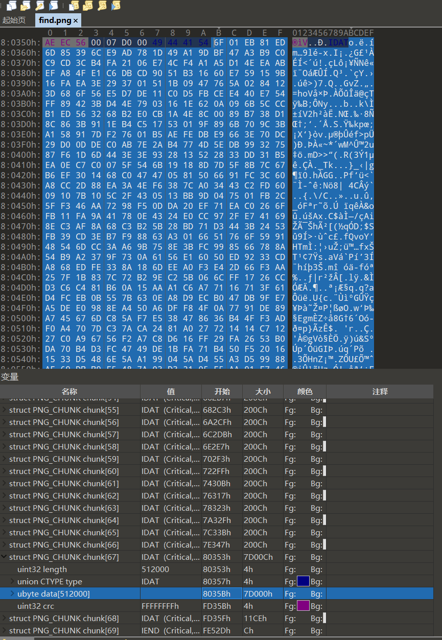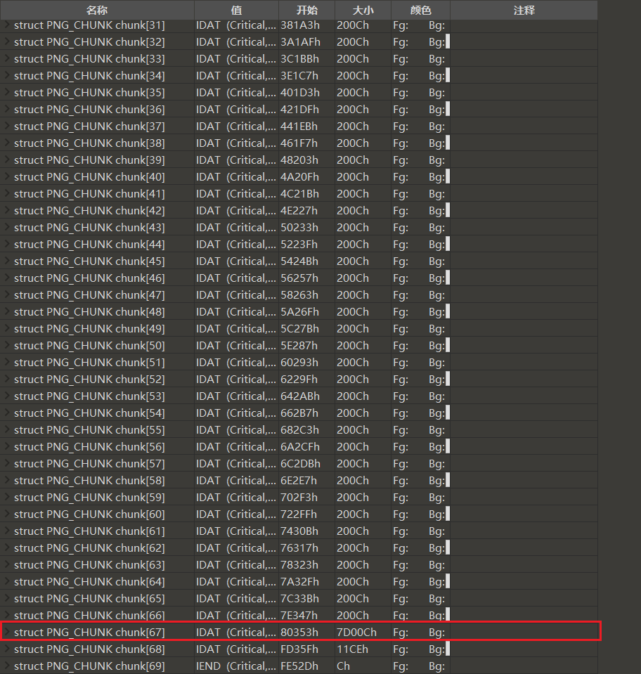 1、使用010editor工具打开png后显示第67块数据CRC校验有问题,