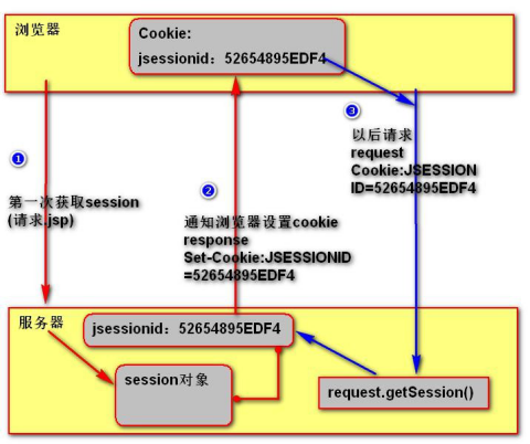 - session的作用就是在服务器端保存一些用户数据,然后传递给用户一个名为jsessionid的Cookie,一个jsessionid对应一个session对象,通过jsessionid就可以获取到用户的信息
