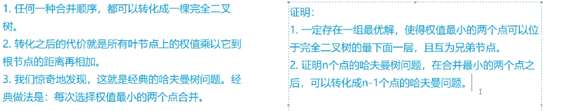我们将每一个叶节点作为最初始的选择,然后挑选其中最小的两个点进行合并,得到的点加入树(集合),如此合并花费的代价最小: