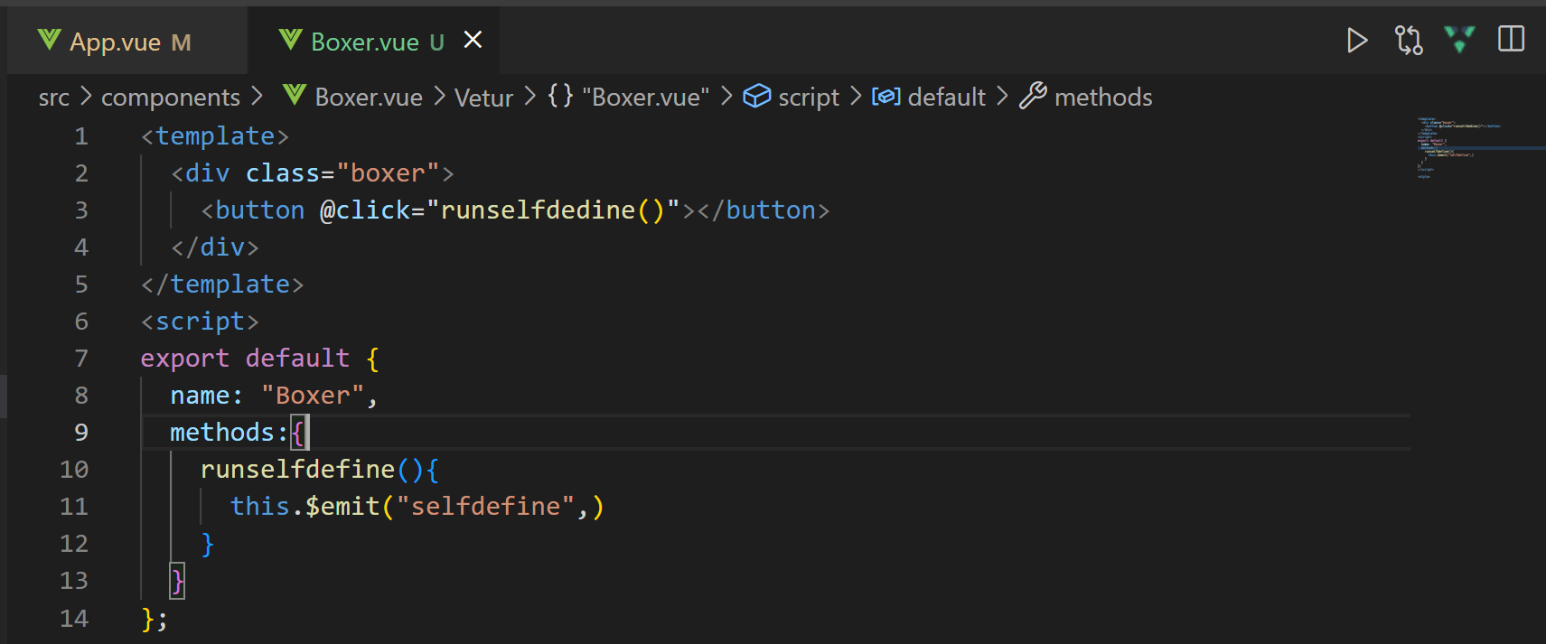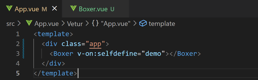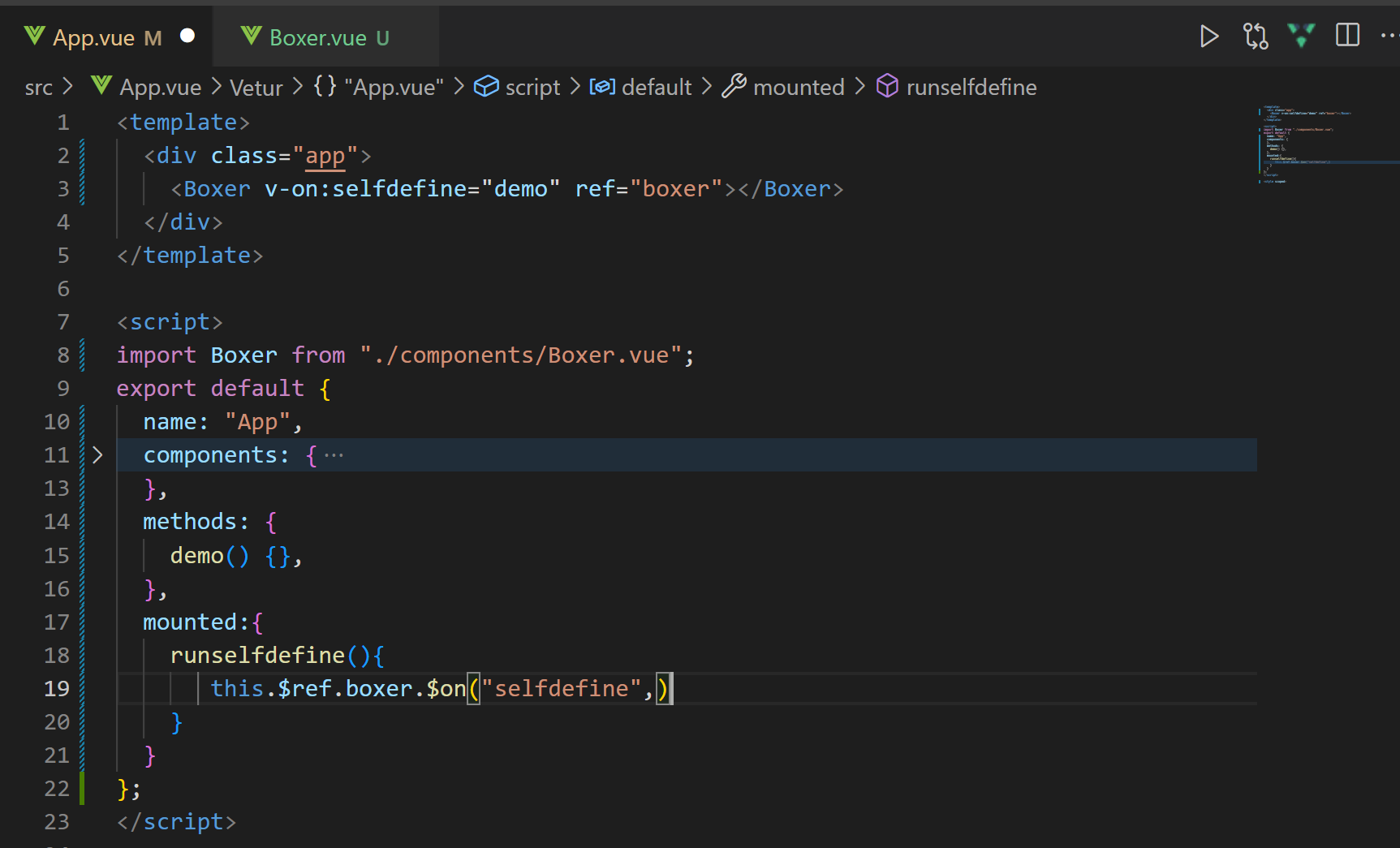 如图我在APP组件中的Boxer组件中写了上面的,意为:我在Boxer组件的实例对象vc上绑定了一个事件,其名为selfdefine事件,